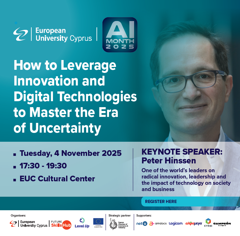 Please be informed that the Cyprus Chamber of Commerce and Industry, as strategic partner, is supporting a highly important event organised by the European University Cyprus (EUC), within the framework of the LEVEL UP project and the EUC AI Awareness Month (European University Cyprus Artificial Intelligence Month).